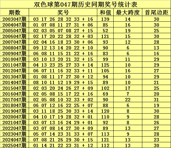 最大跨度推荐:在第047期历史同期开奖中,红球最大跨度全部在6-22之间开出,今年同期注意低位最大跨度出现,参考最大跨度8。