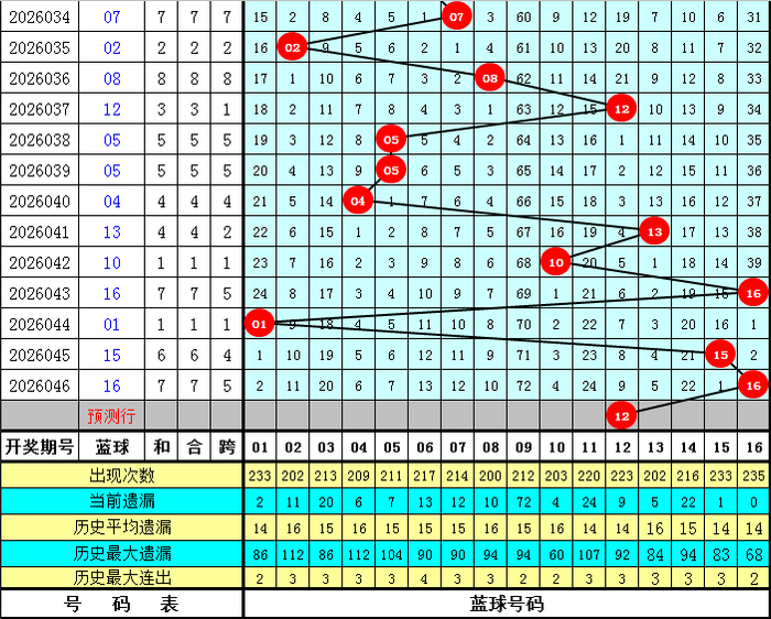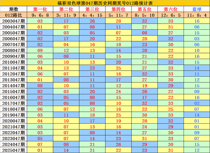 蓝球分析:第047期历史同期蓝球号码012路比开出11:8:4,其中2路蓝球明显偏少,本期放弃2路蓝球,关注蓝球12。